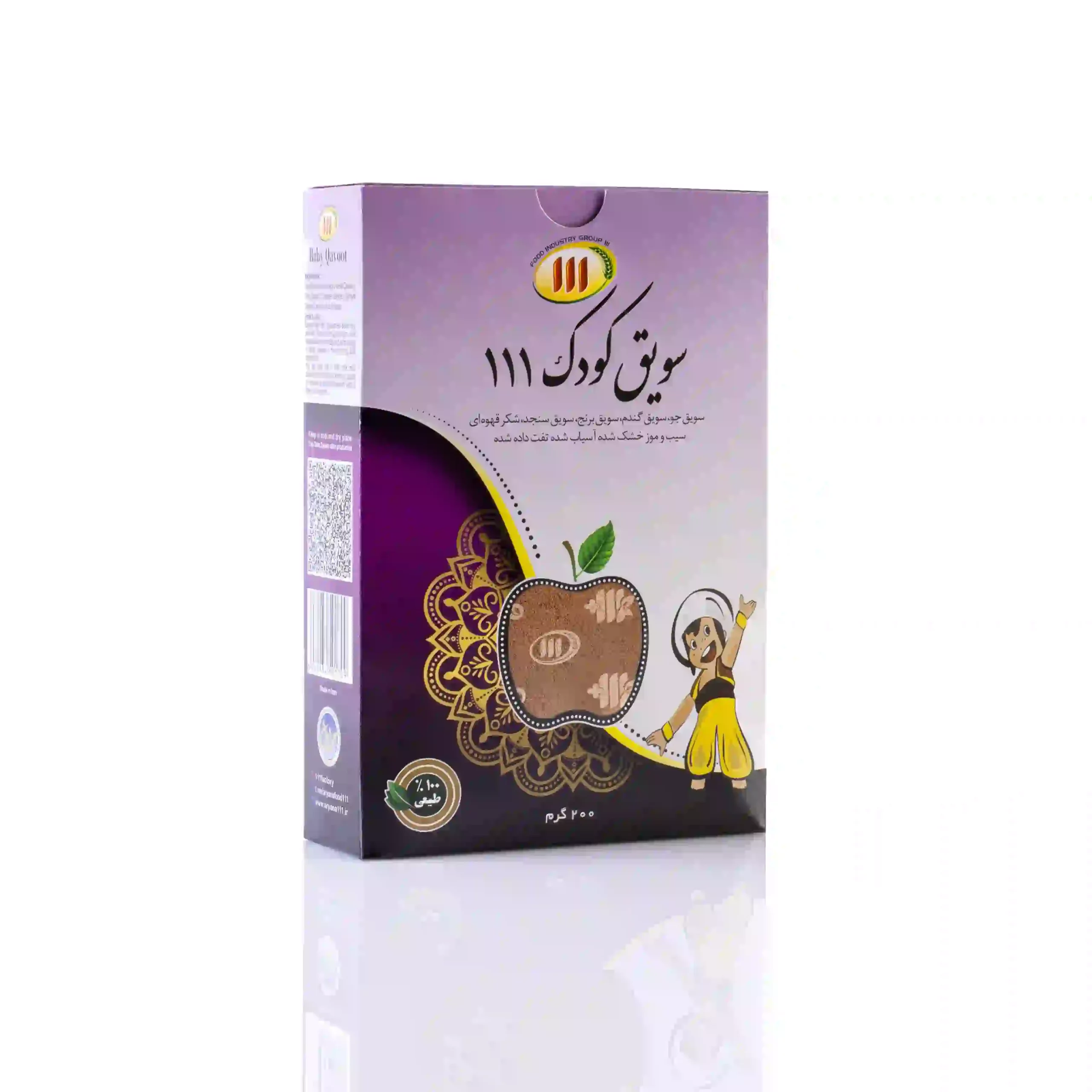 ترکیبات سویق میوه ای کودک: سویق گندم سویق برنج سویق سنجد سویق جو سیب شیرین خشک شده موز خشک شده فاقد مواد نگهدارنده و اسانس وزن محصول: 200 گرم